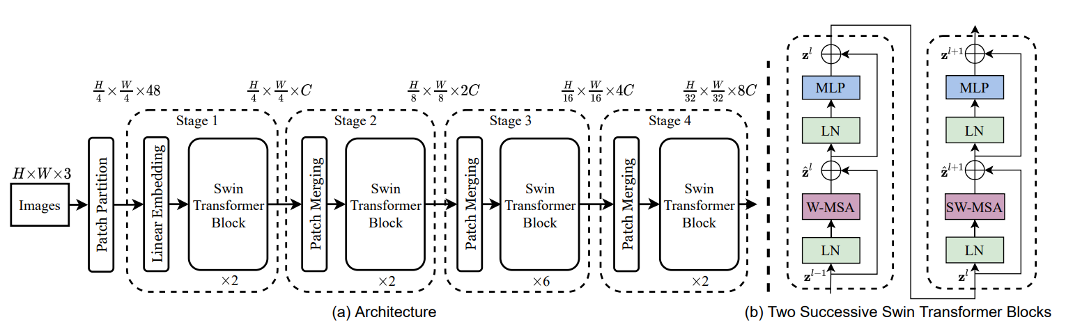 其中 \(MSA=\text{Multi-Head Self-Attention},LN=\text{LayerNorm},MLP=\text{MultiLayer Perceptron}\)